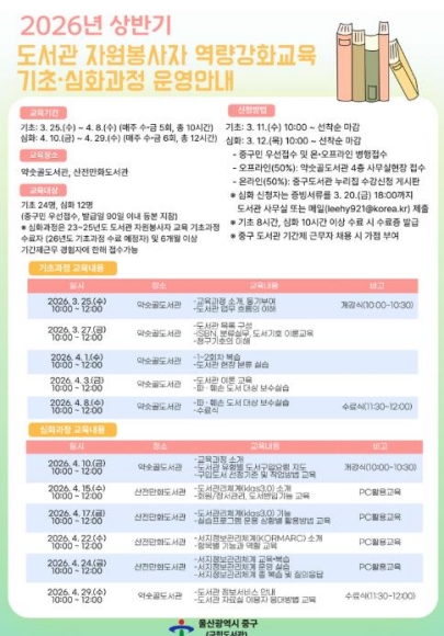 울산 중구가 도서관 운영을 활성화하고 자원봉사 문화를 확산하기 위해 ‘2026년 상반기 도서관 자원봉사자 역량 강화 교육’을 운영한다.