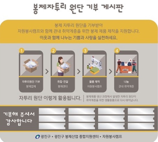 센터가 업체·단체 등으로부터 기부받은 자투리 원단을 선별·분류해 월 1회 동 자원봉사캠프에 인계하면, 자원봉사캠프가 생활용품을 생산하는 방식이다. 재활용이 가능한 면 소재 원단이면 일반 구민도 기부 참여가 가능하다. 센터 방문 또는 유선 신청으로 손쉽게 나눔에 동참할 수 있다.