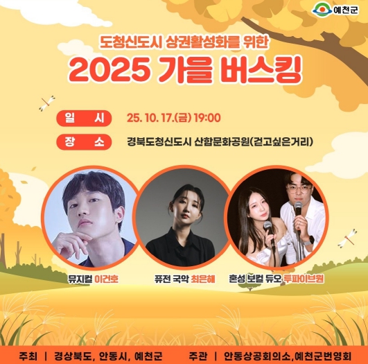 예천군은 17일 오후 7시, 도청신도시 걷고싶은거리에서 ‘가을 버스킹’ 공연을 개최하여 지역 주민들에게 가을밤의 낭만을 선사한다.