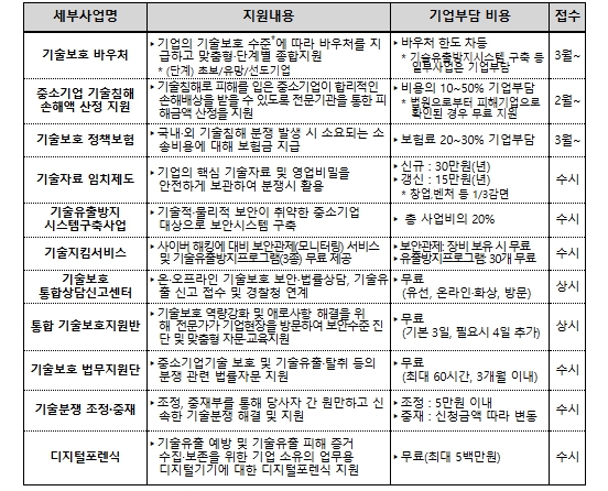 사업별 자세한 내용은 기술보호 통합 포털 기술보호울타리에서 확인할 수 있다.