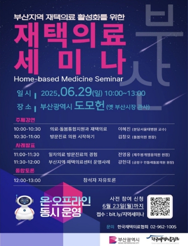 이번 세미나는 주제강연으로 ▲의료·돌봄통합지원과 재택의료 ▲방문진료 의원 시작하기, 사례발표로 ▲일차의료 방문진료 경험 ▲부산지역 재택의료센터 운영사례, 그리고 종합토론 순으로 진행될 예정이다.