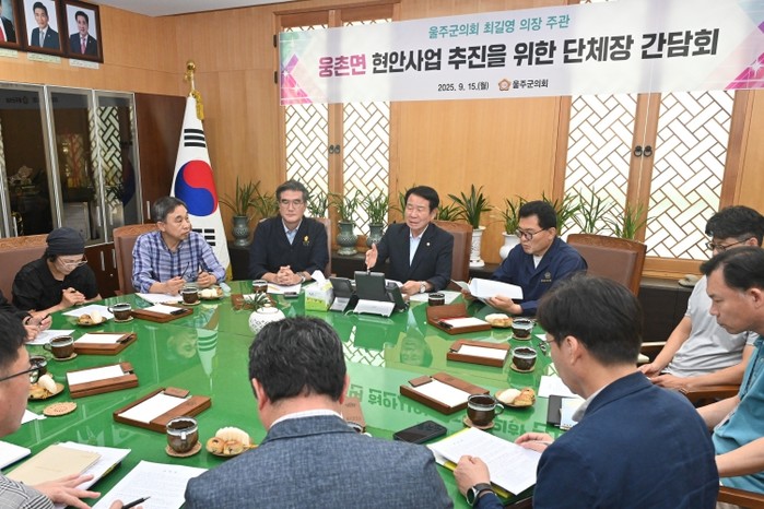울주군의회 최길영 의장은 15일 의장실에서 웅촌면 주민대표들과 간담회를 갖고, 지역의 주요 현안에 대한 의견을 청취했다.