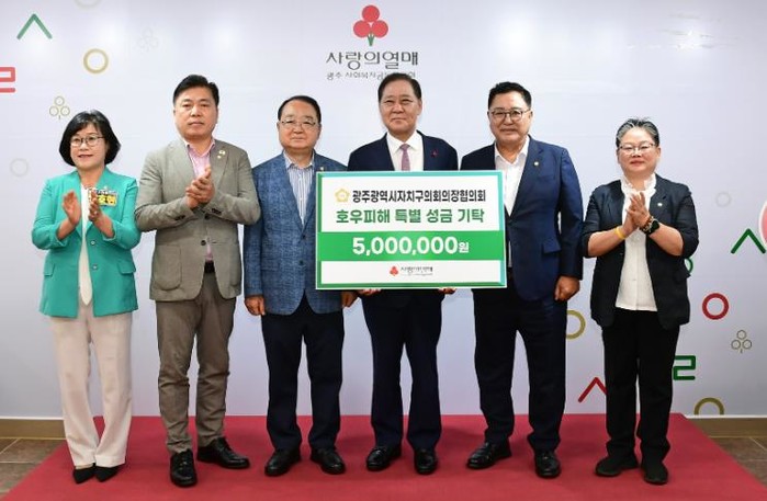 광주광역시 5개 자치구의회 의장들로 구성된 광주광역시자치구의회의장협의회가 24일 집중호우 피해 복구 성금 500만 원을 광주사회복지공동모금회에 기탁했다.
