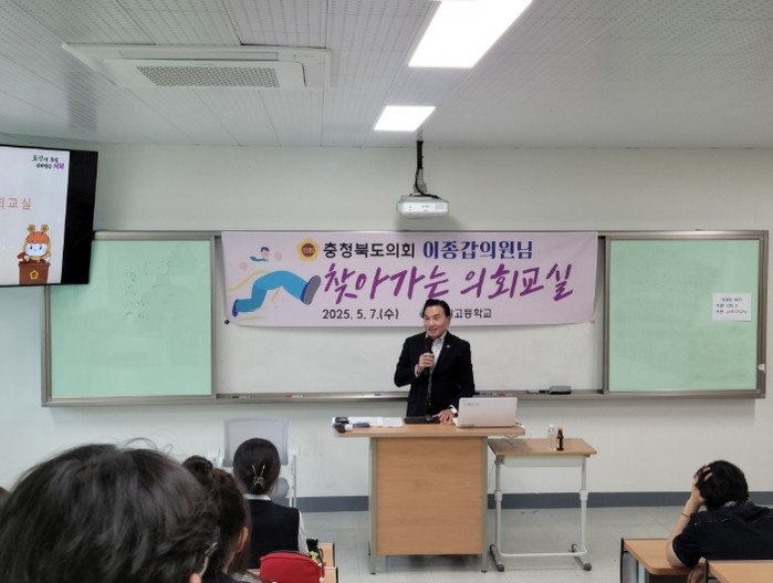 이날 의회교실에는 산업경제위원회 소속 이종갑 의원(충주3)이 참석해 국원고등학교 학생 30여 명을 대상으로 조례 제정 및 개정, 예산·결산 심의, 행정사무감사 등 도의회의 기능을 설명했다.