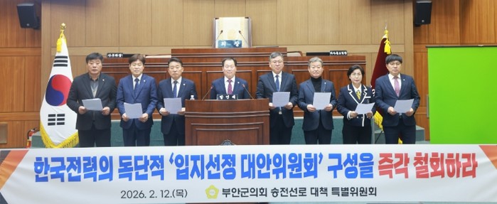 부안군의회 송전선로 대책 특별위원회는 12일 전북 서남권 해상풍력 송전선로 건설사업과 관련해 한국전력공사가 추진 중인 ‘입지선정 대안위원회’ 구성에 대해 강력히 반대하며, 해당 절차의 즉각 중단과 원점 재검토를 촉구했다.
