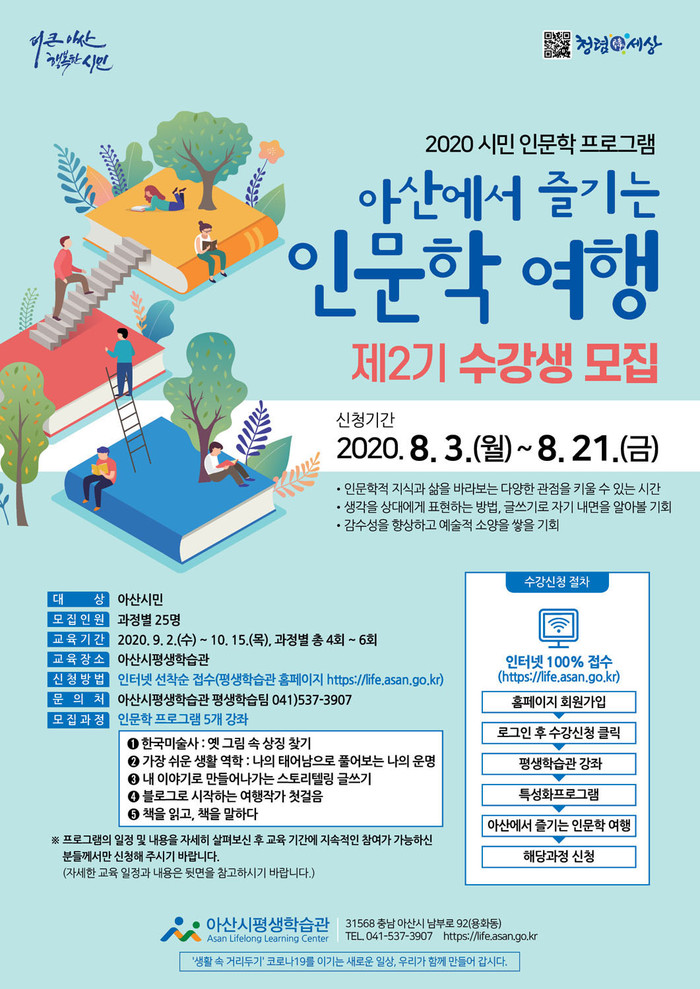 ‘아산에서 즐기는 인문학 여행’ 제2기는 ▲한국미술사, 옛 그림 속 상징 찾기 ▲가장 쉬운 생활 역학, 나의 태어남으로 풀어보는 나의 운명 ▲내 이야기로 만들어나가는 스토리텔링 글쓰기 ▲블로그로 시작하는 여행작가 첫걸음 ▲책을 읽고, 책을 말하다 등 5개 과정으로 구성됐으며 9월2일부터 10월15일까지 과정별 4회에서 6회씩 운영된다.