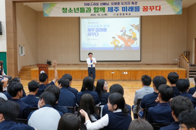 오영훈 제주특별자치도지사는 2일 남원중학교(교장 오경석)를 찾아 전교생을 대상으로 특별강연을 열고, “남원과 제주를 넘어 아시아, 나아가 우주까지 여러분의 무대가 돼야 한다”며 청소년들의 꿈과 도전을 격려했다.