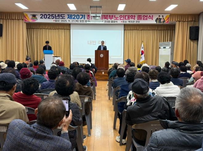 정읍시북부노인대학은 27일 정읍시북부노인복지관 강당에서 제20기 졸업식을 열고, 지난 4월부터 28회 교육 과정을 무사히 마친 170명 어르신에게 축하를 전했다.