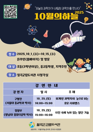 김재욱 칠곡군수는 “10월의 하늘 과학 강연이 청소년들에게 미래 과학자로 성장할 꿈의 씨앗이 되길 바라며, 도서관이 새로운 배움과 영감을 전하는 장으로 다양한 프로그램을 이어가겠다” 전했다.