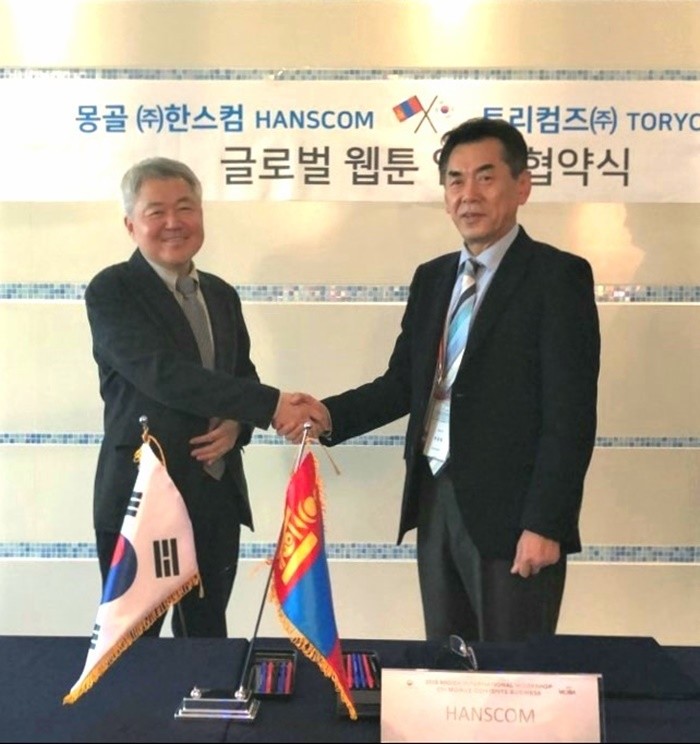 글로벌 웹툰 제작 회사인 토리컴즈 주식회사는 15일 몽골 HANSCOM과 `웹툰 플랫폼 및 웹툰 작가 및 웹툰 PD 육성을 위한 ICT MOU`를 맺었다.
