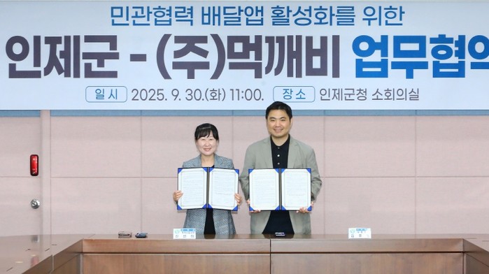 인제군은 9월 30일 군청 소회의실에서 민관협력 배달앱 ‘먹깨비’ 운영사와 업무 협약을 체결하고, 지역 소상공인 경영 안정과 군민 편익 증진을 위한 본격적인 협력에 나섰다.