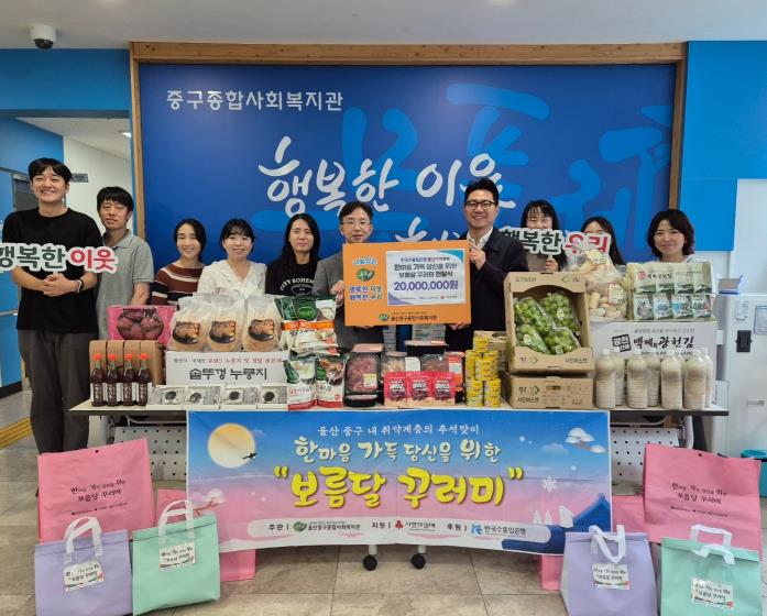 한국수출입은행 울산지역본부가 9월 25일 오전 10시 30분 울산중구종합사회복지관을 찾아 취약계층을 위한 2,000만 원 상당의 추석맞이 보름달 꾸러미 135개를 전달했다.