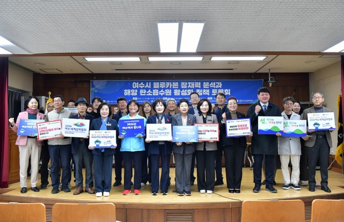 여수시의회 의원연구단체 ‘기후변화대응 탄소중립 연구회’(대표의원 정신출)가 11월 3일 전남대학교 산학연구관에서 ‘여수시 블루카본 잠재력 분석과 해양 탄소흡수원 활성화 정책 토론회’를 개최했다고 밝혔다.