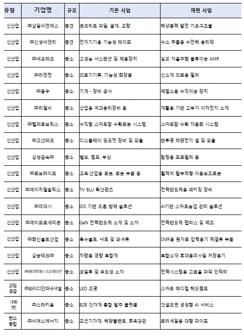 사업재편계획 승인기업의 주요 내용은 다음과 같다. ㈜고산테크는 고효율 태양전지 셀 시장에 진출하고, ㈜신성씨앤티는 수소플랜트의 수전해 핵심부품인 분리막을 국산화한다. ㈜로보라이프는 로봇제어기술을 활용해 수동휠체어에 탈부착이 가능한 이동보조로봇을 개발해 안전성과 편리성을 높이고, ㈜화신볼트산업은 고온 열처리 기술을 바탕으로 SMR 기자재 시장에 진출한다. ㈜에이치엘옵틱스는 실리콘카바이드 전력반도체를 균일하게 접합해 패키징의 불량률을 크게 줄이는 장비를 개발하고, ㈜삼일씨엔에스는 해상풍력발전용 기초구조물을 제작해 해상풍력 공급망을 강화한다.