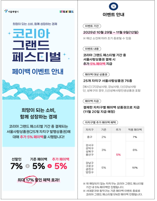 서울시는 오는 10월 29일부터 11월 9일까지 12일간 열리는 ‘코리아 그랜드 페스티벌(Korea Grand Festival)’ 기간 동안, 서울시 25개 자치구 서울사랑상품권으로 결제하면 결제금액의 5%를 추가로 페이백하는 행사를 추진한다고 밝혔다.