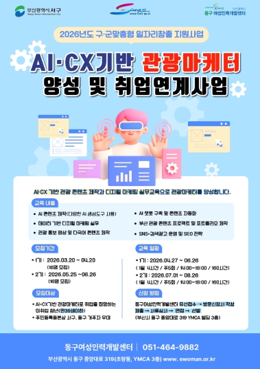 부산 서구와 동구가 연합하여 부산시 공모사업인 '2026년 구·군 맞춤형 일자리 창출 지원사업'에 선정돼 지역 관광산업 경쟁력 강화와 청년 일자리 창출을 위한 ‘AI·CX 기반 관광마케터 양성 및 취업연계 사업’을 추진한다.