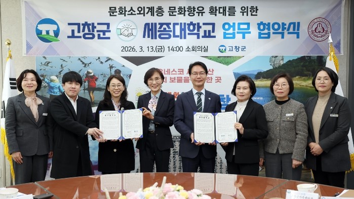 고창군은 지난 13일 세종대학교(총장 엄종화)와 지역 내 문화소외계층의 문화접근성 향상과 문화향유 기회 확대를 위해 업무협약을 체결했다.