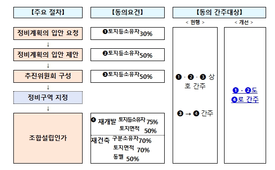 복잡한 행정절차, 동의 확보는 최대한 한번에, 미리 처리할 수 있게 하고, 조합이 확보해야 하는 국ㆍ공유지 확보 부담을 완화할 수 있도록 규제 합리화 방안을 담았다.