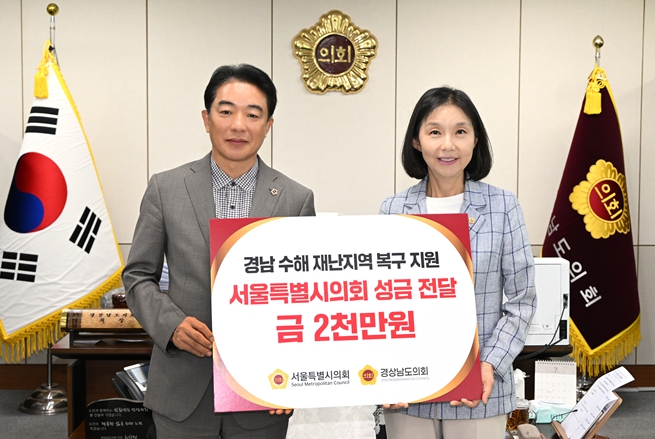 서울특별시의회 최호정 의장은 7월 24일 경남도의회를 찾아, 폭우로 큰 피해를 입은 산청·합천 등의 조속한 복구를 돕기 위해 서울시의원들의 뜻을 모아 마련한 2천만 원의 성금을 최학범 경남도의회의장과 박희순 대한적십자사 경남지사 회장에게 전달했다.
