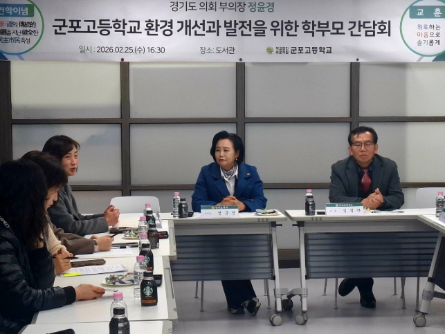 경기도의회 정윤경 부의장(더불어민주당, 군포1)은 2월 25일 군포고등학교 도서관에서 교직원 및 학부모들과 ‘학교 환경 개선과 발전을 위한 학부모 간담회’를 개최하고 학교 현안 전반에 대해 의견을 나눴다.