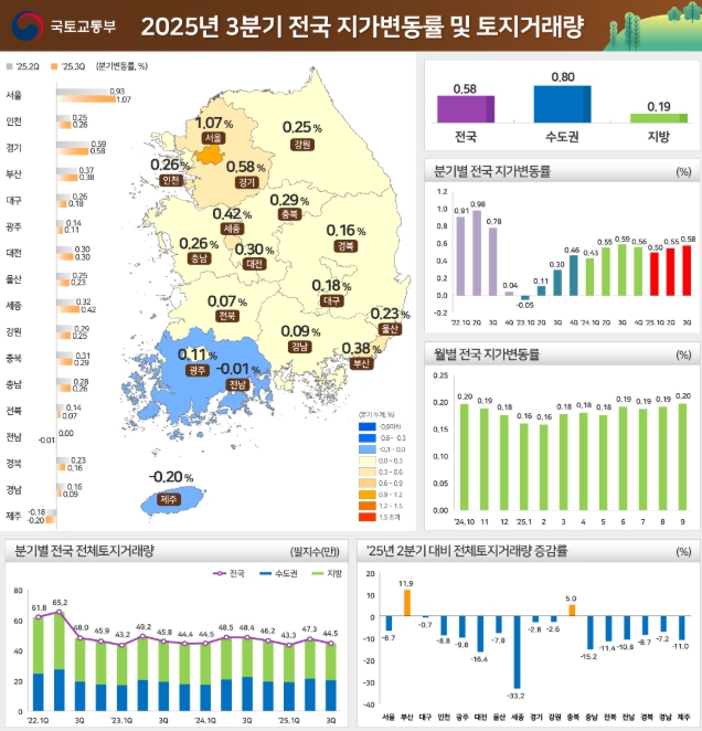 국토교통부와 한국부동산원(원장 손태락)은 '25년 3분기 지가변동률 및 토지거래량을 발표했다.