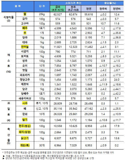| ▲ 주요 농축산물(28개 품목) 소비자가격 동향(4.16일 기준) |