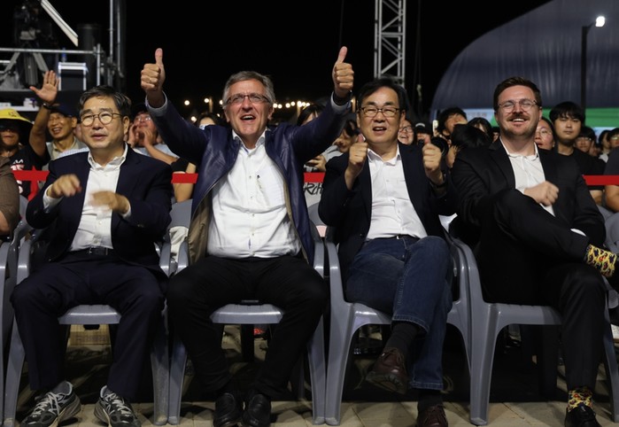 ▲ 강상구 나주시 부시장(왼쪽)과 토마스 그리스 교수(왼쪽 두 번째)가 영산강정원에서 케이팝 콘서트를 관람하고 있다. |