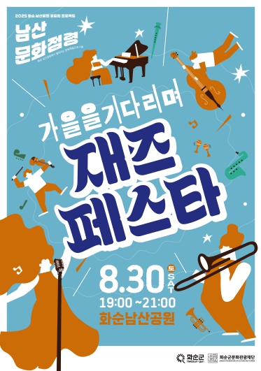 (재)화순군문화관광재단(이사장 구복규)은 8월 30일 오후 7시~ 9시까지 화순 남산공원 야외무대에서 ‘가을을 기다리며 재즈 페스타’를 개최한다고 밝혔다.