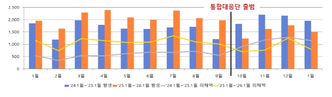 그 결과, ’25년 9월까지 전년 동기간 대비 증가세를 보이던 보이스피싱은 ’25년 10월 이후 ’26년 1월까지 4개월 연속 발생 건수와 피해액 모두 감소했다.