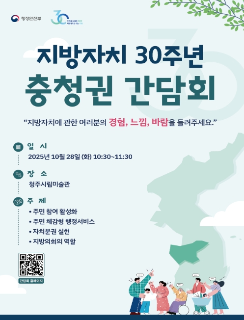 행정안전부는 10월 28일 충청북도 청주시립미술관에서 민선 지방자치 30주년 충청권 간담회를 개최한다고 밝혔다.