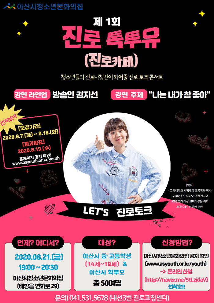 이번 진로 톡투유는 방송인 박지선을 초청해 ‘나는 내가 참 좋아’라는 진로 강연을 진행할 예정이며 오는 21일 아산시청소년문화의집 내에서 진행된다.