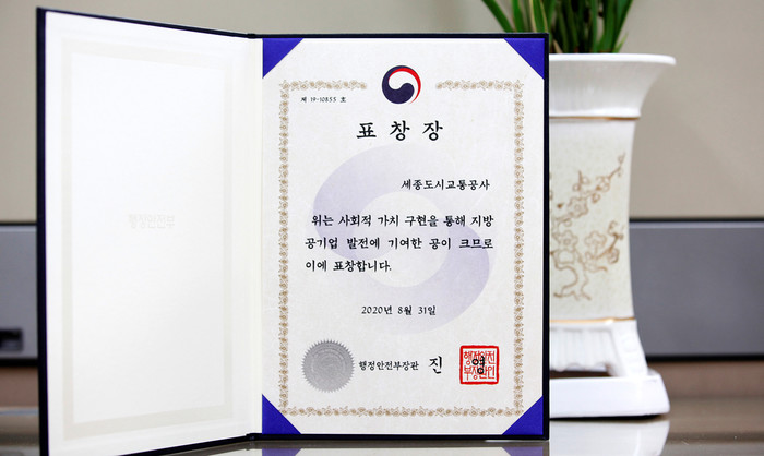 세종도시교통공사(사장 배준석)는 지난달 31일 사회적 가치 구현을 통해 지방공기업 발전에 기여한 공으로 행정안정부장관 기관표창을 수상했다고 3일 밝혔다.