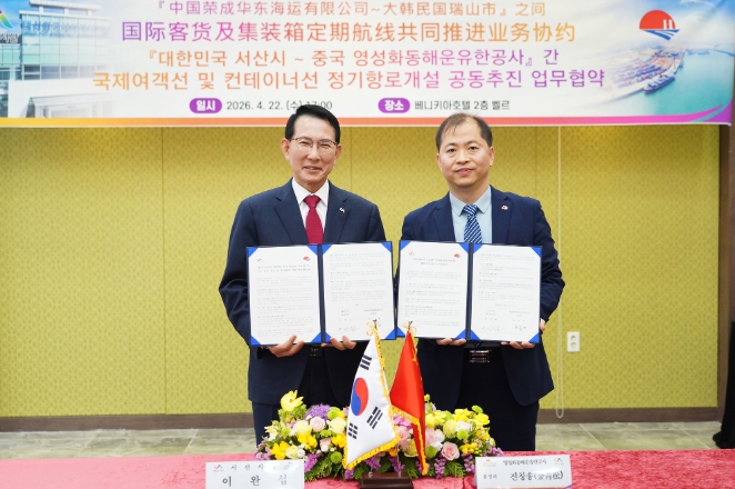 이날 협약 체결은 시가 올해 개최될 제28차 한중 해운회담에 서산시 대산항~영성시 석도항 국제여객항로 및 컨테이너 항로 개설을 해양수산부에 공식 의제로 제출한 데 따른 후속 조치다.