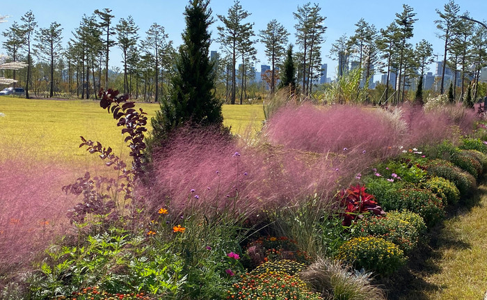 가을을 대표하는 국화와 아스타(국화과 다년초), 그라스(벼과 정원식물) 등이 어우러진 사계절꽃길과 팜파스그라스(그라스류 벼과식물)를 활용한 감성적인 포토존을 구성했다.