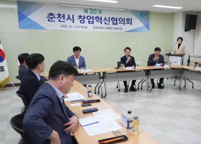 춘천시가 1일 강원대 보듬관 대회의실에서 정재연 강원대 총장, 한림대 최양희 총장을 비롯한 14개 지역내 유관기관 관계자들이 참석한 가운데 제20차 춘천시 창업혁신협의회를 개최했다.