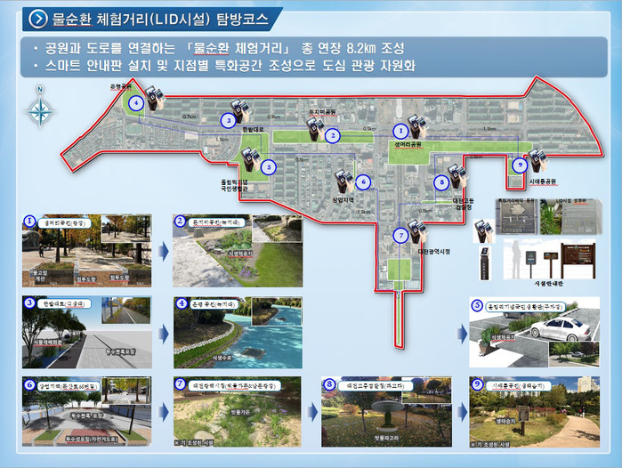 이와 함께 샘머리공원을 출발지점으로 둔지미~한밭대로~은평~시청~시애틀공원 등 사업지내 공원과 주요도로를 연결하는 총 연장 8.2㎞의 ‘물순환 체험거리’는 시민과 외지인이 찾는 레저ㆍ힐링공간으로 재창조된다.