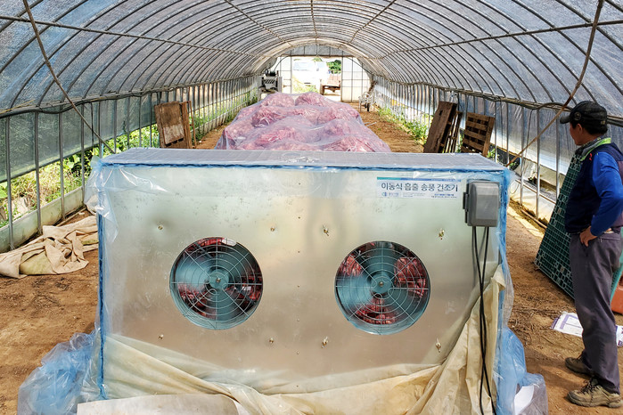마늘 송풍건조기는 비닐, 팔레트 등 건조 장비 포함 세트당 300만원 선이며 이동형으로 편리하고 간편하게 사용할 수 있다.