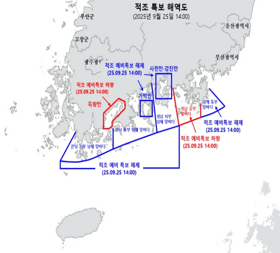 이는 국립수산과학원이 경남 중부앞바다와 득량만 2개 해역에 내려진 적조 주의보를 예비특보로 낮추고, 나머지 6개 예비특보 해역을 모두 해제한 데 따른 조치이다.