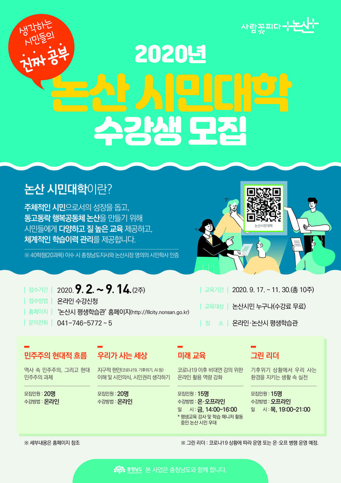 ‘민주주의 현대적 흐름’과 ‘우리가 사는 세상’은 온라인 교육으로 진행되며 ‘그린 리더’와 ‘미래 교육’ 과정은 코로나19 상황에 따라 온‧오프라인 교육을 병행 실시할 예정이다.