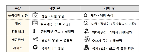 우선 돌봄의 중심이 병원·시설에서 재가·예방으로 옮겨져, 입원·입소 경계선상의 노인·장애인 등이 살던 곳에서 필요한 서비스를 지원받을 수 있게 된다. 소득 기준 중심의 지원에서 벗어나, 노인·장애인의 돌봄 필요도를 기준으로 서비스를 연계해 제공함으로써 사각지대를 줄인다.