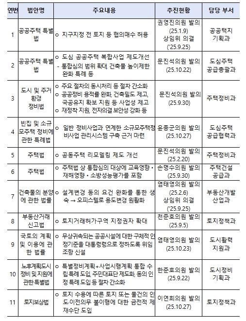 아울러, 공급 확대 기반 마련을 위한 법・제도 개선의 경우 법률 개정이 필요한 20개 입법과제 중 지난 1차 회의 이후 4건이 추가 발의*되어 현재까지 11건이 기 발의됐으며, 구체적인 개정안이 마련된 2개 과제는 11월 중 발의될 수 있도록 국회와 긴밀히 협의하고, 나머지 7개 과제는 연내 개정안 마련을 목표로 관계기관 협의 등 절차를 차질 없이 추진할 계획이다.