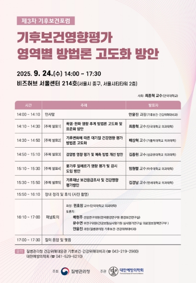 질병관리청은 대한예방의학회(회장 홍영습)와 함께 '3차 기후보건포럼'을 9월 24일 오후 2시, 비즈허브 서울센터(서울시 중구 소재)에서 개최한다.
