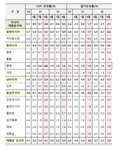 아시아·태평양 지역 ’25년 물가상승률의 경우, 국제 유가 및 식료품 가격 하락 등의 영향으로 물가가 안정화될 것으로 예측하며 7월 전망보다 0.3%p 하향한 1.7%로 전망했다. 또한 ’26년 물가상승률은 2.1%로 7월의 전망을 유지했다.