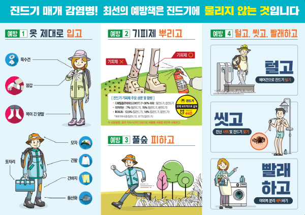 또한 야외 활동 후 2~3주 이내 발열, 두통, 소화기 증상 등이 나타날 경우 즉시 의료기관을 방문하여 진드기 물림이나 야외활동력을 알리고 적기에 치료를 받아야 한다.