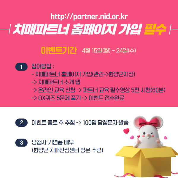 이벤트 참여방법은 치매파트너 누리집(http://partner.nid.or.kr) 가입(관리→함양군지정)→치매파트너 소개 탭→온라인 교육 신청→파트너 교육 필수 영상(60분) 시청→OX퀴즈 풀기 등의 과정을 거쳐 이벤트에 참여할 수 있다.