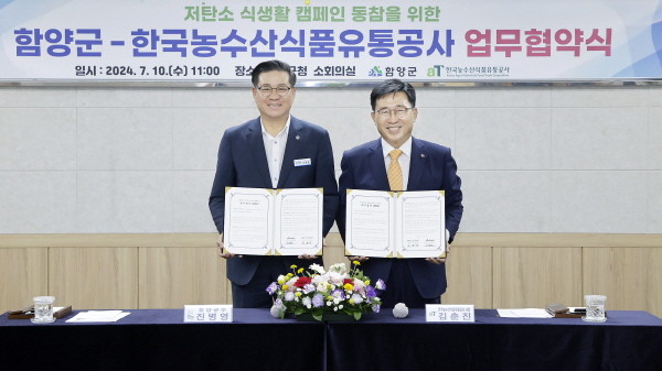 함양군은 법령 등이 정한 범위 내에서 행정적·재정적 지원을 위해 노력하고, 농수산식품유통공사는 업무협약 시행 및 운영을 통해 지역경제 활성화에 이바지하기로 역할을 분담했다.