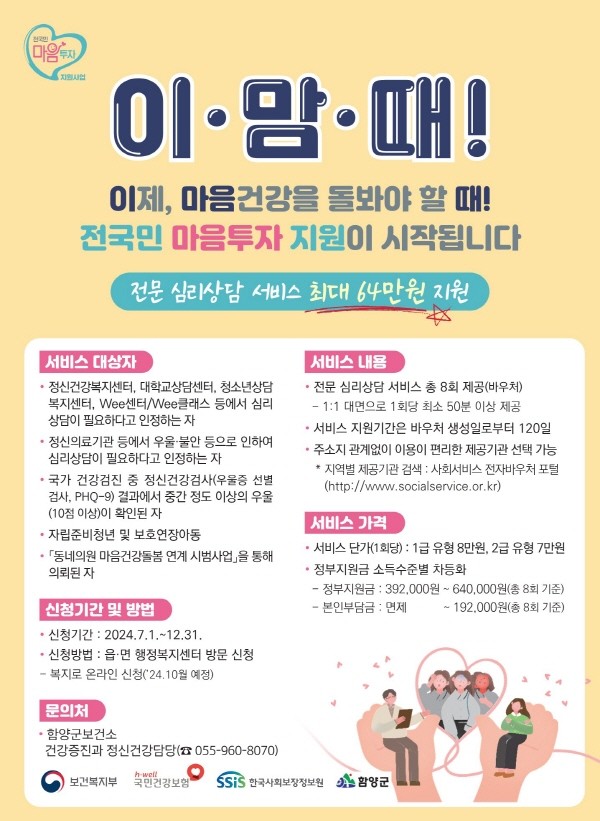 자세한 사항은 함양군보건소 건강증진과 정신건강담당(055-960-8070)으로 문의하면 된다.