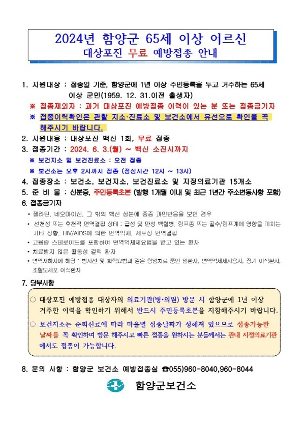 함양군은 민선 8기 주요 공약사업으로 고가의 접종 비용으로 인한 어르신들의 경제적 부담 감소와 접종률 향상을 위해 올해부터는 65세 이상 군민 전체로 무료 접종 대상자를 확대했다.