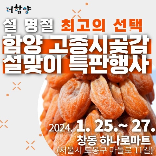 이번 행사에는 지리산과 덕유산 아래 곶감생산농가 10농가와 농특산물 생산업체 5개 업체가 참여하여 설맞이 특판행사를 개최하는 것으로 서울의 고객들에게 곶감할인 판매한다.