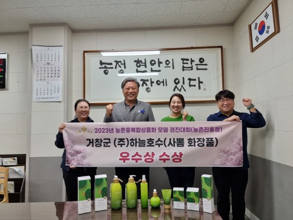 이번 경진대회는 지역자원을 활용한 농촌융복합상품의 개발과 유통을 통해 지역농산물의 부가가치 향상과 소득 증대에 기여하는 경영체를 선발하기 위해 열렸으며, ㈜하늘호수는 사과와 약초 화장품을 개발해 거창사과 브랜드 이미지를 높이고 농가소득 향상에 기여한 공을 높이 평가받았다.